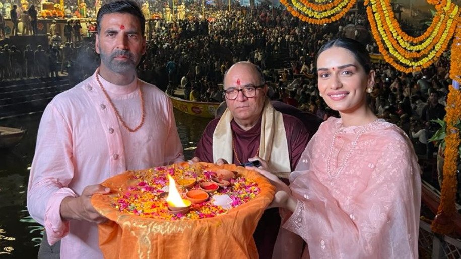 Bollywood star Akshay Kumar is busy promoting his upcoming film Samrat Prithviraj. He along with his co-star Manushi Chillar visited Varanasi on Monday and was seen taking blessings of the Lord Mahadev and performing Ganga Aarti.