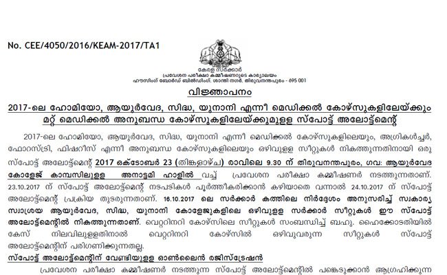 Interested candidates should download the ‘Spot Allotment Slip’ by clicking the link ‘Spot Allotment Registration’ at the KEAM 2017 Candidate Portal before 1pm on 22.10.2017.