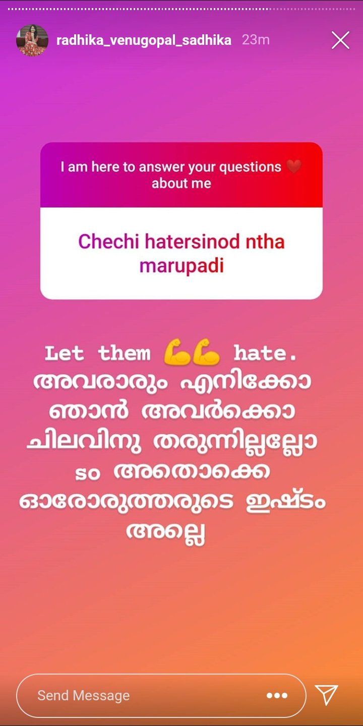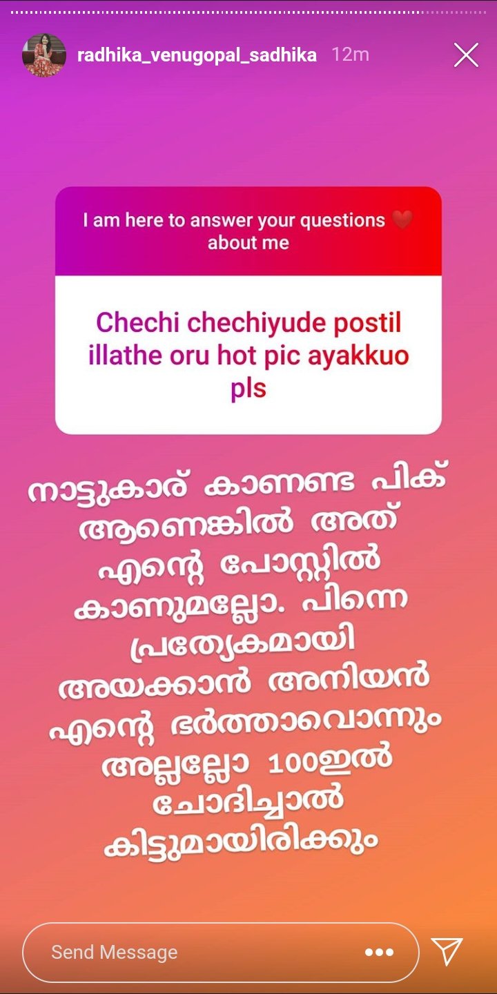 Sadhika is very active on social media. Sadhika Venugopal is constantly updating her fans on all her new experiences.