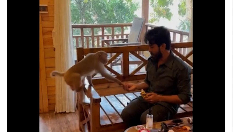 On the occasion of Hanuman Jayanti today, megastar Chiranjeevi dropped a cute BTS video of Ram Charan from the sets of ‘Acharya’ and extended wishes to his audiences. In the video, we can see his Ram Charan feeding a monkey.