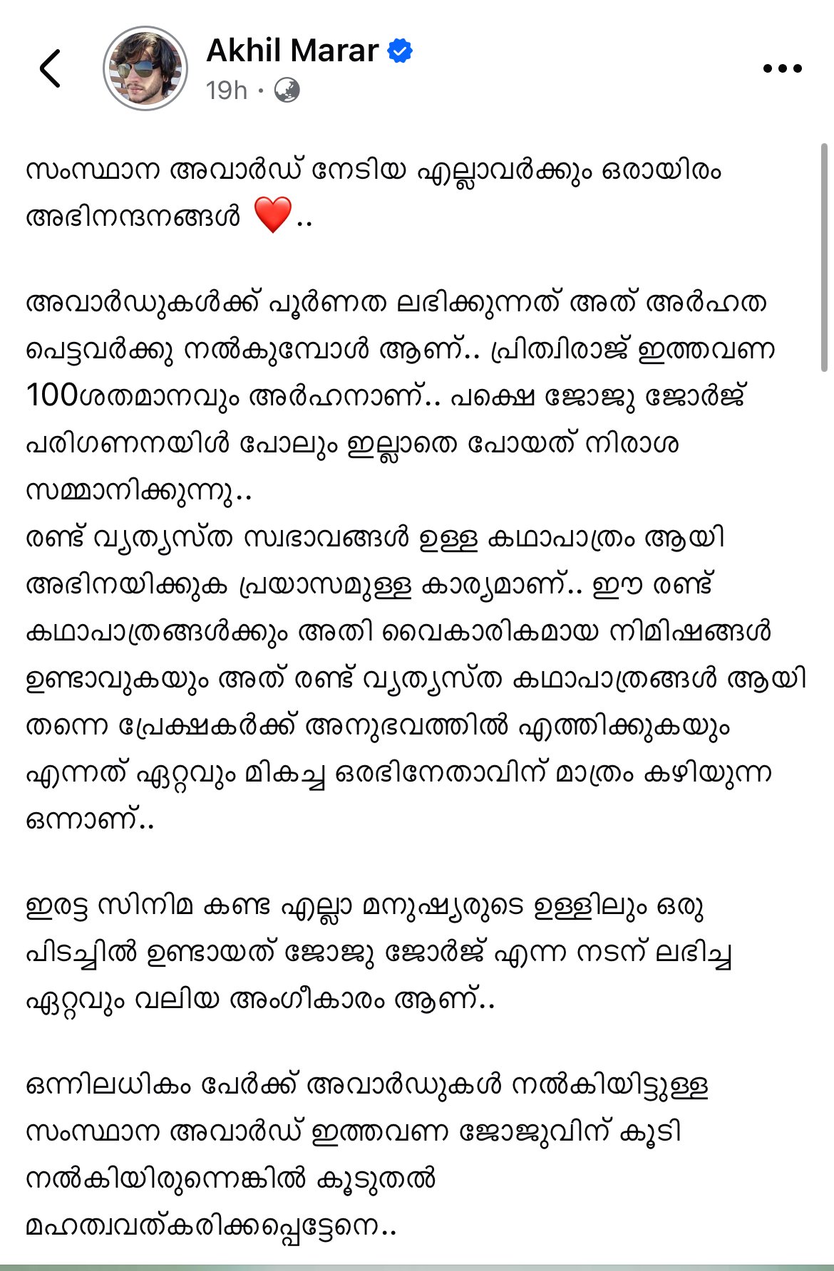 Director and former Bigg Boss winner Akhil Marar shared a note on social media that is attracting attention. Akhil wrote on social media that Prithviraj is 100% deserving of the best actor award, but Joju George was not even considered for the consideration and it was a disappointment. A thousand congratulations to all those who have won the state award… Awards are perfect when they are given to those who deserve them. Prithviraj deserves hundred percent this time. But the fact that Joju George was not even considered is disappointing. It is difficult to play a character with two different personalities. Both of these characters have emotional moments and make the audience experience them as two different characters, which is something only the best actor can do. Joju George is the biggest accolade for actor Joju George, who felt a twinge in every human being who watched the movie.