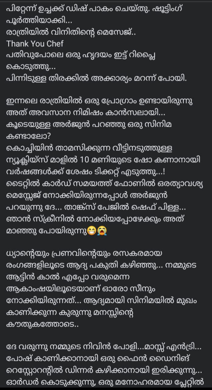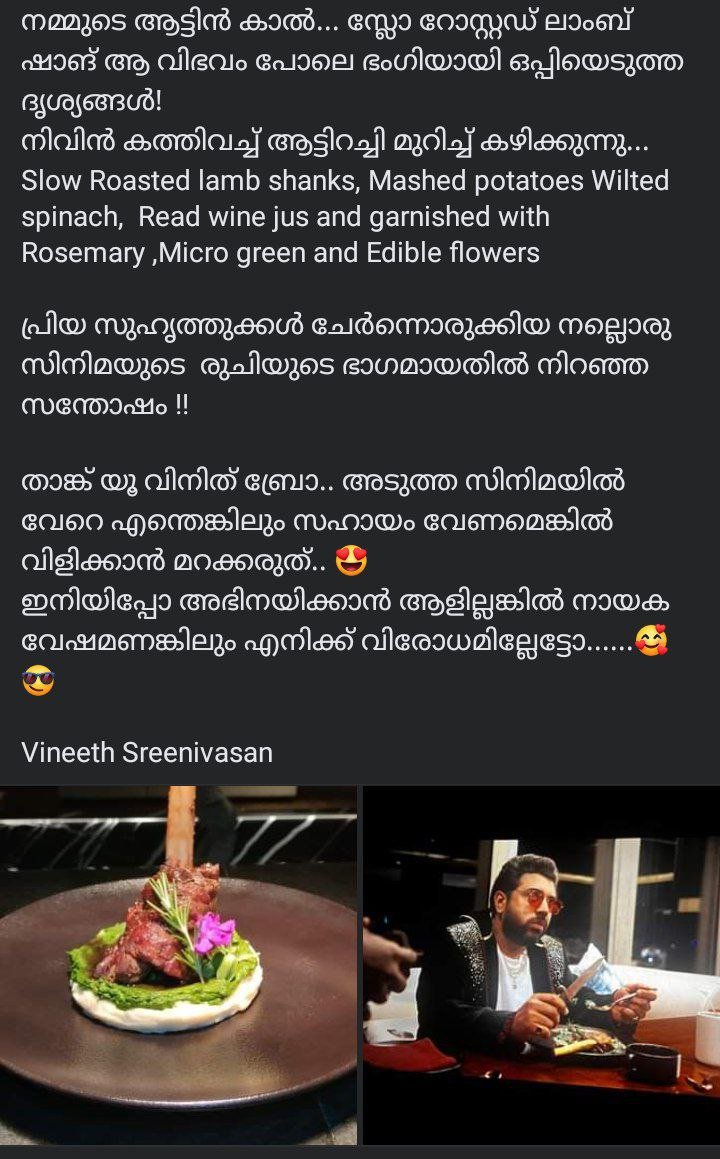 He has shared this post on Facebook. He says that it was specially prepared as requested by Vineeth Srinivasan. Apart from this, he has also shared pictures of Nivin Pauly eating the dish. He also says that if you need any help like this in the next film, don't forget to call. Anyway, let's read his post which is now making waves in the social media: