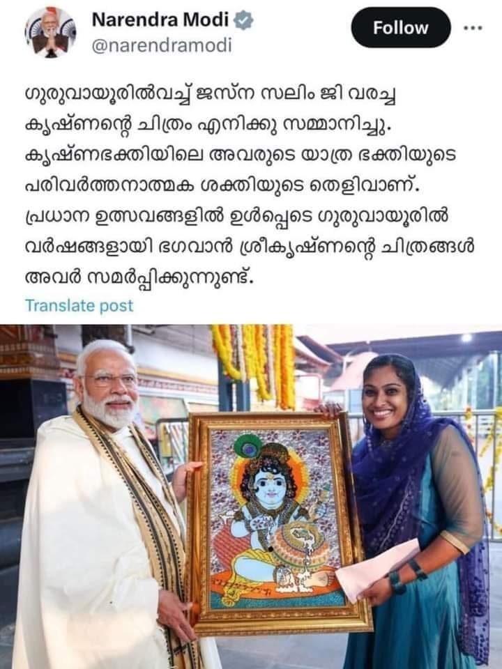 At the same time, Jasna Saleem thanked Suresh Gopi’s mind for fulfilling someone else’s wish even in the midst of rush. Jasna also dedicated a new painting to Kannan to thank him for fulfilling his desire to present a painting to the Prime Minister. Jasna Salim Krishna, a native of Kozhikode, is notable for painting Krishna paintings and presenting them at the Guruvayur Temple.