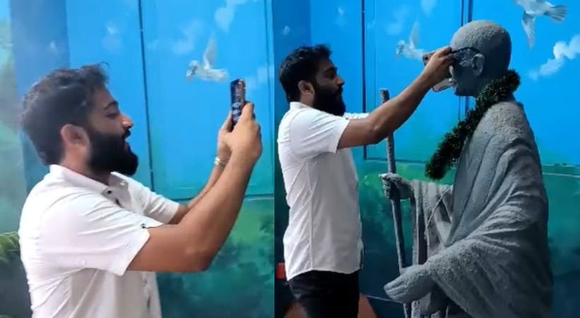 A student of Aluva Chundi Bharat Mata Law College named Adin Nasser Gandhi put black glasses on the statue. The incident of putting glasses on the statue of Gandhi in the college was during the Christmas celebrations.