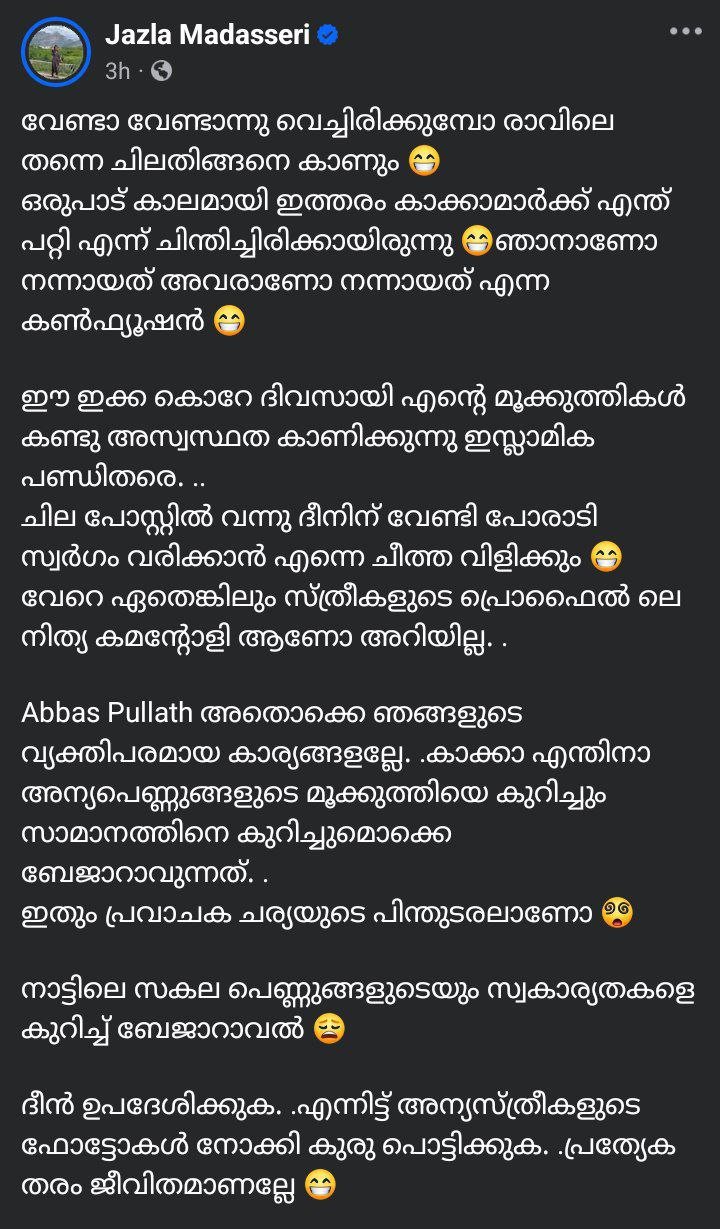 Jasla Madassery is one of the most loved stars of Malayalees. The actor is noticed through social media. They often comment on social, cultural and political issues in the country. He is a person who frequently criticizes religion. Therefore, they have earned a lot of hatred from a section. Often, men from this category come and leave obscene comments under their posts. But they give a short answer to all that.