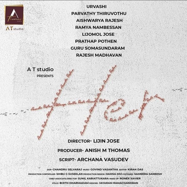 Her is an upcoming Malayalam Drama movie produced by Anish M Thomas and directed by Lijin Jose. It is produced under the banner of AT Studio. The movie stars Urvashi, Parvathy Thiruvothu, Aishwarya Rajesh, Ramya Nambeesan and Lijomol Jose in the lead roles. Prathap Pothen, Guru Somasundaram, Rajesh Madhavan are also part of the cast. The cast, crew, release date, posters , trailer and other details of the movie are given below.