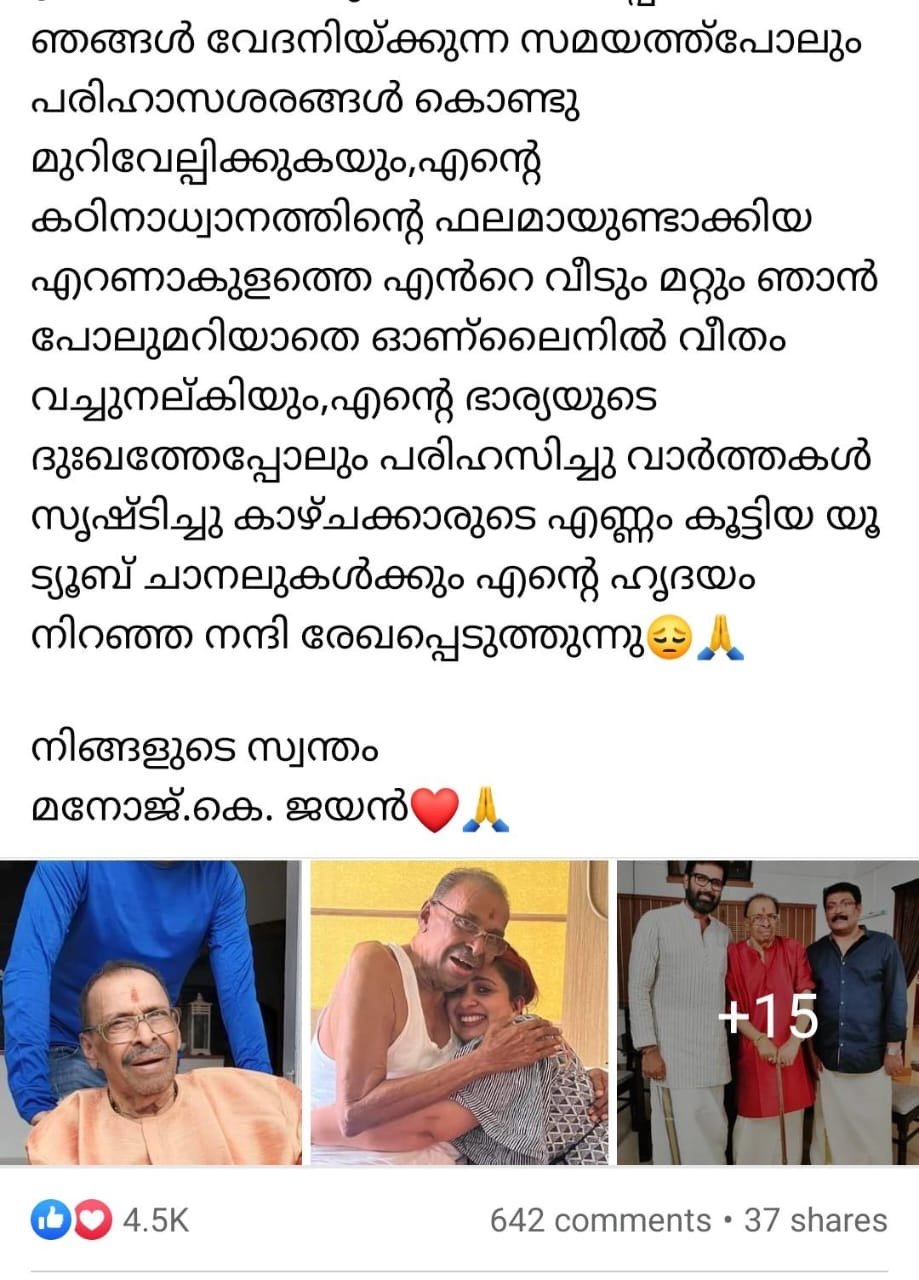 My father was so much more than Asha, who lost her father at the age of 15. Her playfulness, care, and loving reprimands are the reason for father's health and happiness. It can never be accomplished with a few words. Saying nothing to a group of people who do not understand the value and warmth of relationships, who see sarcasm and beauty in everything and criticize everything, is of no use. She is not a niece in my family. It was troubling how some looked down on even a daughter's deep love for her father. But it's an instinctive, deep connection. She is the only one who realizes her loss. I am deeply grateful to the youtube channels that made news and increased viewership by making fun of my wife's grief, even when we were in pain and were hurt by ridicule, my house in Ernakulam, which was the result of my hard work, was put online without my knowledge. K. Jayan