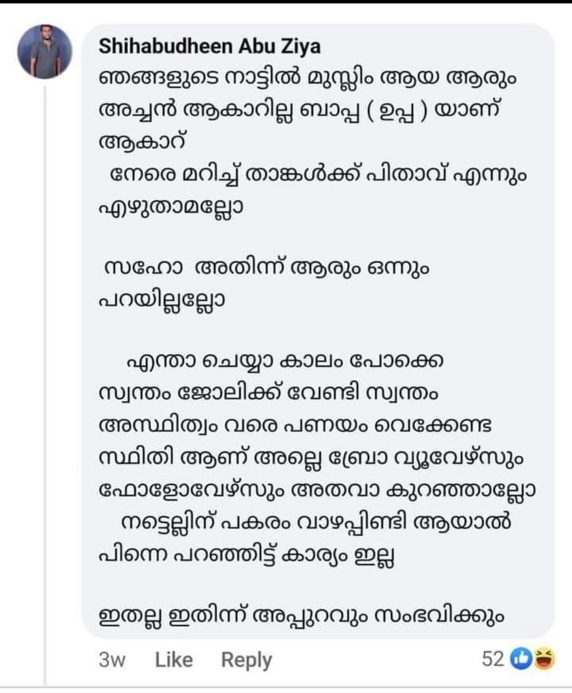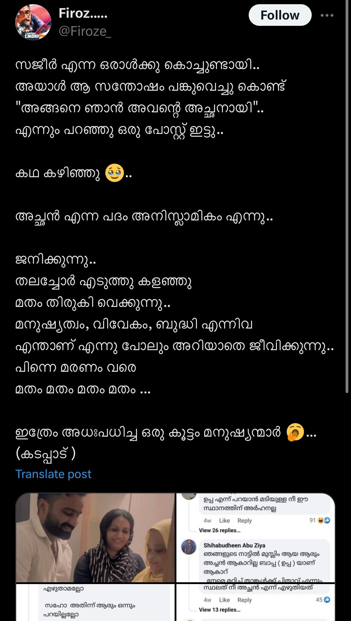 A tweet from an account called Feroze is now going viral on social media. The clip contains a photo of a father receiving a baby and comments below it. The words are, a man named Sajeer has a baby boy. As a father”!. I put a post saying that.. the story is over. The word father is un-Islamic. He is born.. his brain is removed and religion is inserted.. he lives without even knowing what is humanity, wisdom and intelligence.. and then until death, religion religion religion religion