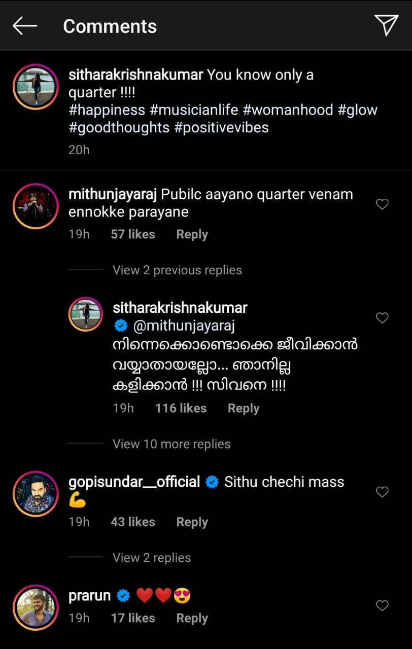 Sithara Krishnakumar is one of the favorite singers of Malayalees. Sithara is a star who shines on the mini screen as well. Sithara announces all her latest news on social media. They are very active on Instagram. Following is a comment from a photo posted by them the other day. Commented by Mithun Jayaraj.