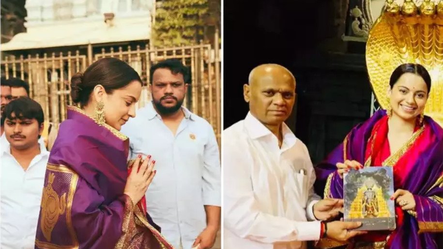 The actress on Monday was seen seeking blessings for her film at Tirupati Balaji. Kangana was accompanied by her producer Deepak Mukut. Taking to her Instagram, Kangana dropped pictures from her visit to the temple and she is seen donning a gorgeous silk saree, paired with golden jhumkas.