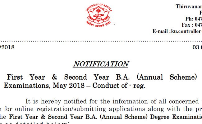 Kerala University published the notification for the First & Second Year BA (Annual Scheme) examination schduled to be held in May 2018. It is hereby notified for the information of all concerned that the last date for online registration/submitting applications along with the prescribed fee for the First Year & Second Year B.A. (Annual Scheme) Degree Examinations, May 2018 are as detai led below: