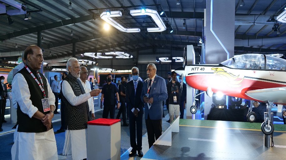 Prime Minister Narendra Modi unveiled HTT-40, an indigenous trainer aircraft designed and developed by Hindustan Aeronautics Limited (HAL), at the India Pavilion during 12th DefExpo in Gandhinagar, Gujarat on October 19, 2022.