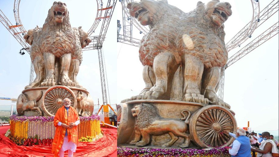 Prime Minister Narendra Modi unveiled the National Emblem cast on the roof of the New Parliament Building today morning.