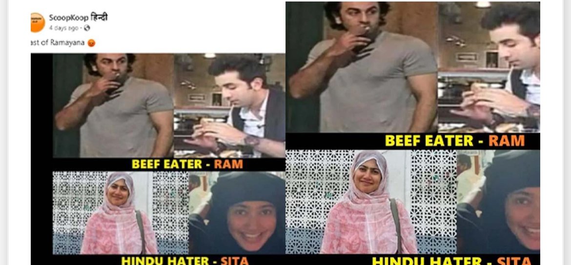 Extremist Hindutva pages are full of similar posts against both of them. It's all trolls saying that Rama in the new Ramayana is a beef eater and Sita is anti-Hindu. The post also shared a photo of Ranbir smoking at a party and Sai Pallavi wearing a burqa to watch her film Shyam Singha Roy with her fans. There is a huge protest on social media against pages that run such hate campaigns against actors who do not agree with their ideas. The pages Scoop Coop Hindi and Scoop Coop Bharat are fronting this hate camp.