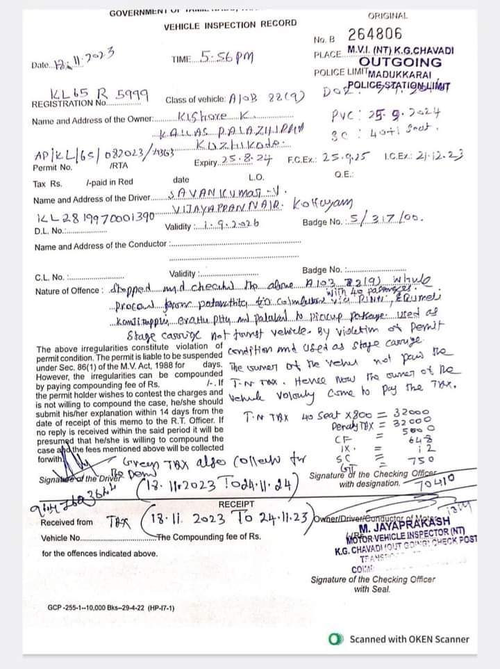 Robin Motors was fined at the Chavadi check post. The bus owner had to pay twice the amount charged in Kerala. A fine of Rs 70,410 had to be paid.