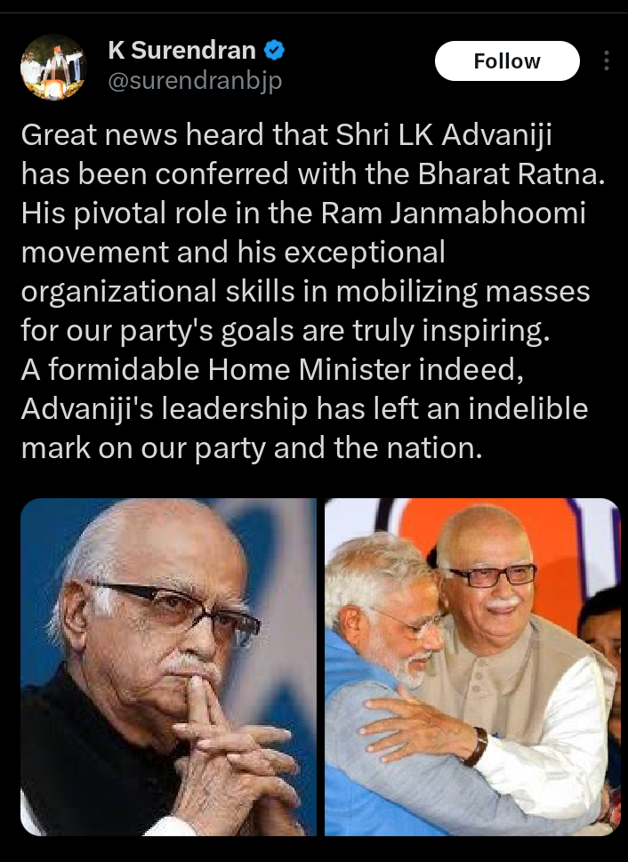 Congratulating former Deputy Prime Minister LK Advani on the award of Bharat Ratna, BJP Kerala State President K. Surendran.