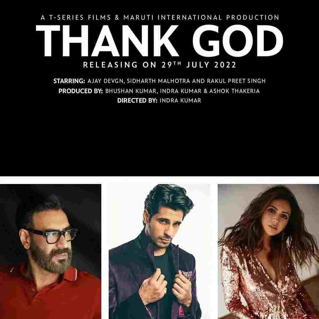 Thank God is an upcoming Hindi comedy movie directed by Indra Kumar and produced by Bhushan Kumar, Krishan Kumar, Ajay Devgn, Sunir Kheterpal, Ashok Thakeria, Deepak Mukut, Anand Pandit, Markand Adhikari and Bhaumik Gondaliya. It is produced under the banner of T-Series & Maruti International. The movie stars Ajay Devgn, Sidharth Malhotra and Rakul Preet Singh in the lead roles. Shalani Tharaka and Nora Fatehi are also part of the cast. The cast, crew, release date, posters , trailer and other details of the movie are given below.
