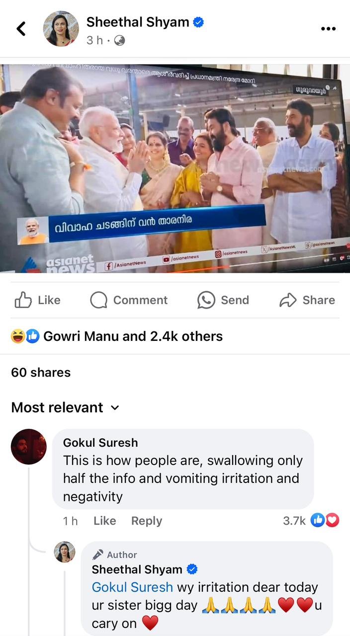 Meanwhile Suresh Gopi’s son and actor Gokul Suresh has come to comment on this film. He commented that some people are like this, they swallow only half the information and vomit irritation and negativity. To this Sheetal Shyam replied this is why irritation why celebrate your sister’s big day today? Many people have come to support Suresh Gopi and his family through comments.