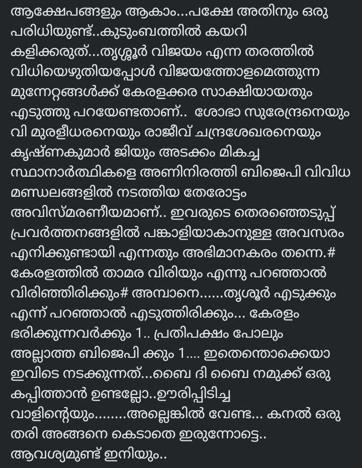 Many people are coming to his post with good comments. He says that this victory belongs not only to BJP but also to those who are known by many names like Kami, Sudapi, Kongi, Urban Naxal etc. He says that Suresh Ettan got this brute majority through the constant efforts of all of them. Here is the full text of Vivek Gopan’s post: