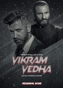 Vikram Vedha is a Hindi action-thriller drama movie directed by Pushkar and Gayathri and produced by S. Sashikanth and Bhushan Kumar. It is produced under the banner of YNOT Studios and Plan C Studios. The movie stars Saif Ali Khan, Hrithik Roshan, Radhika Apte and Rohit Saraf in the lead roles. The movie also stars Yogita Bihani, Sharib Hashmi, Satyadeep Misra, Durgaprasad Mahapatra, Rati Shankar Tripathi and Abdul Ahad Shaikh in supporting roles. The cast, crew, release date, posters , trailer and other details of the movie are given below.