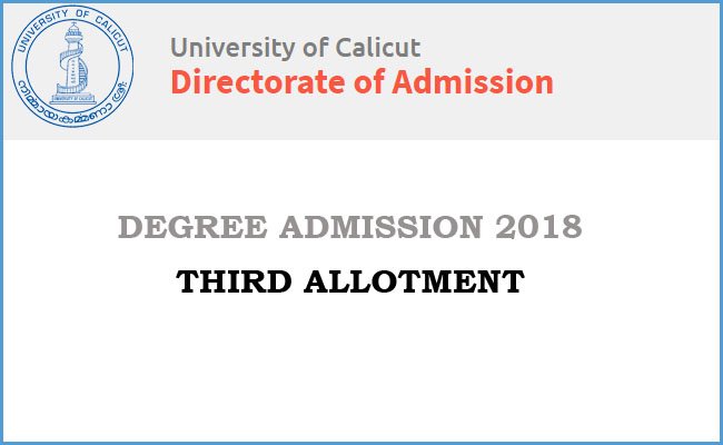 Calicut University UG CAP 2018 Third Allotment: The Third allotment will be published on the scheduled date notified by Calicut university admission cell. All candidates received Calicut University UG CAP 2018 Third Allotment for the first time should remit mandatory fee to claim their allotment. Candidates already remitted mandatory fee after the first and second allotment need not pay the mandatory fee again.The candidates failing to remit mandatory fee will lose allotment received and will not be considered for further allotments.