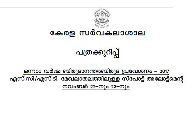 Kerala University PG Admission Spot Allotment for SC/ST