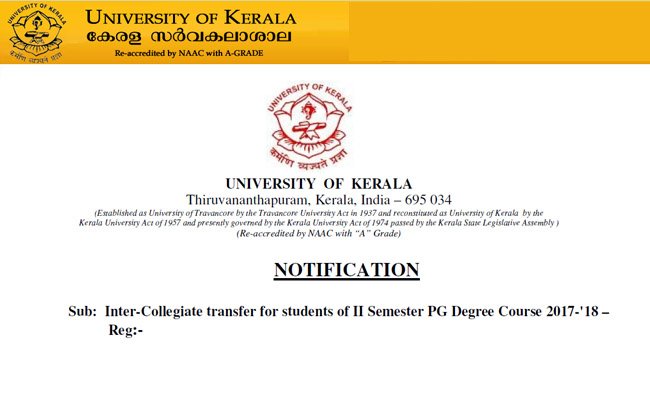 Kerala University PG Degree Inter-Collegiate transfer for 2nd Semester