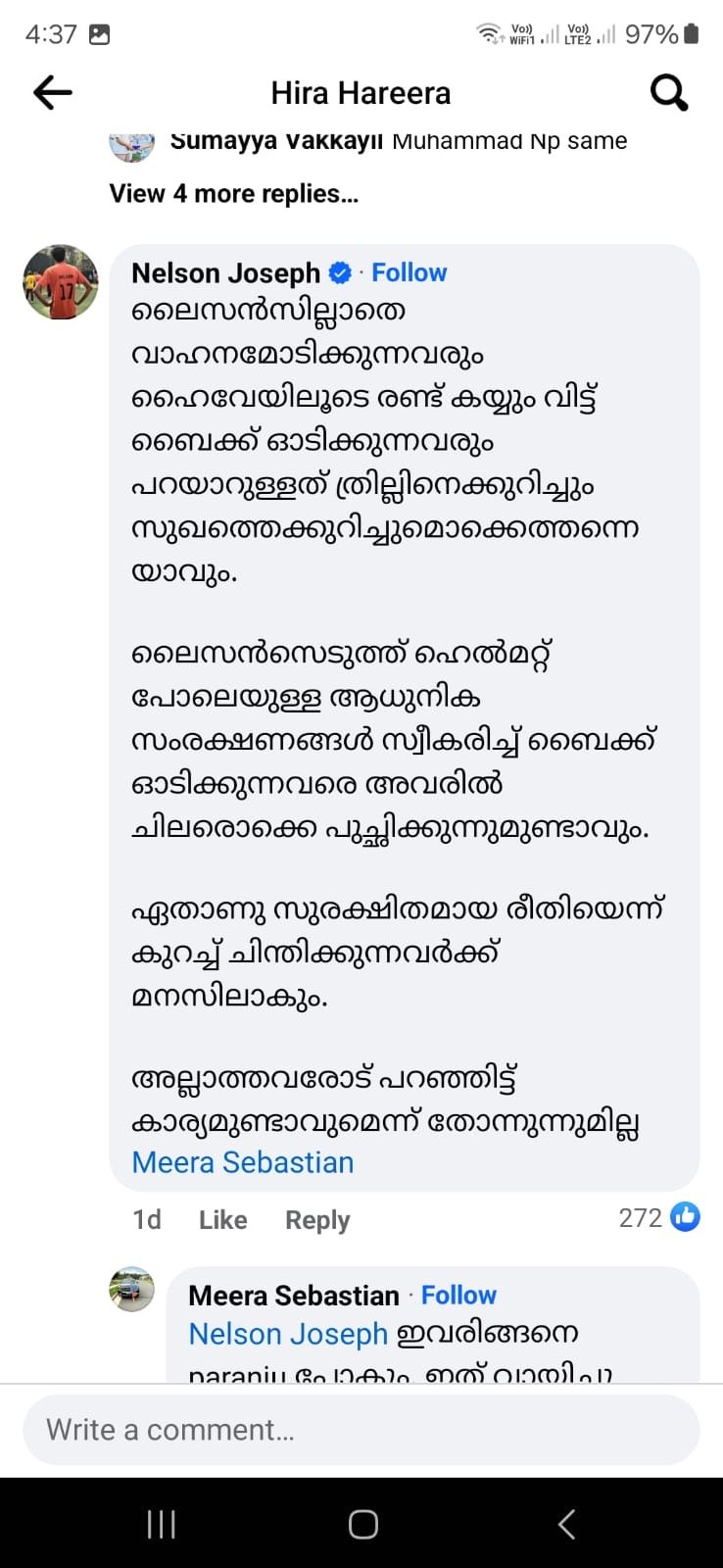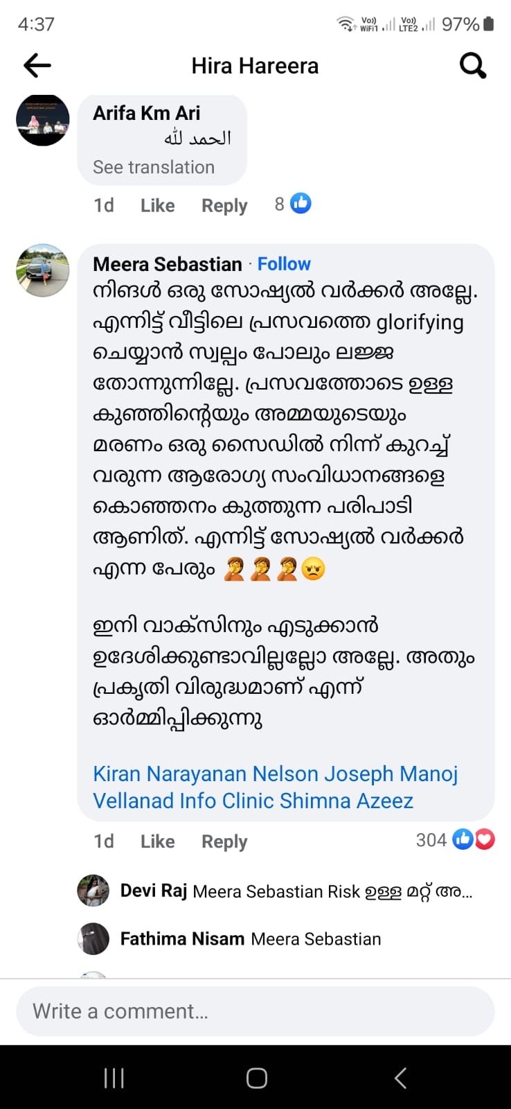 The post of Heera Harira is currently being discussed in a big way on social media. The post is about giving birth at home. Many people have come in favor and against it. Most of the criticisms have come. One person has commented that this person who is also a social worker is hurting the health sector. Some other comments are as follows. Nelson This is the comment that came from the account named Joseph, those who drive without a license and ride a bike on the highway with both hands are talking about the thrill and the pleasure. Some of them may look down on those who ride bikes with licenses and modern protections like helmets. A few thinkers will know which is the safer method. It doesn't seem like there would be any point in telling people who don't