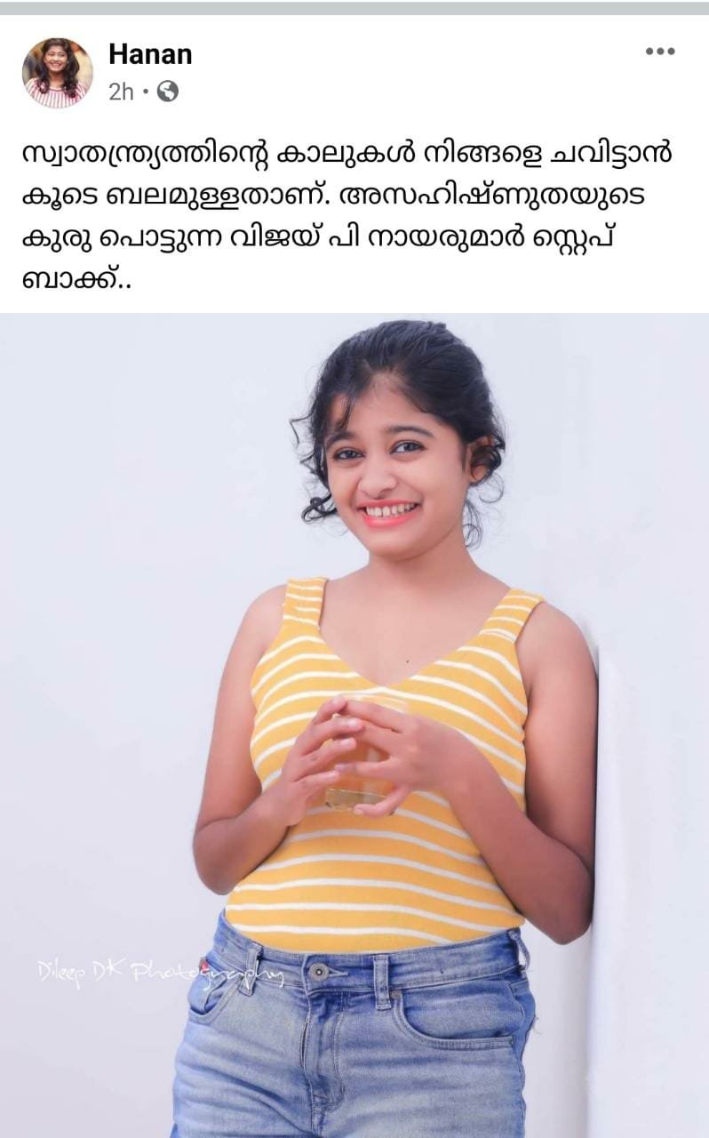 Hanan shared a picture with the caption, “Freedom’s legs are strong enough to trample you. Vijay P Nair, who breaks the seeds of intolerance, please come back.” In the picture, Hanan is also seen wearing low-cut clothes.