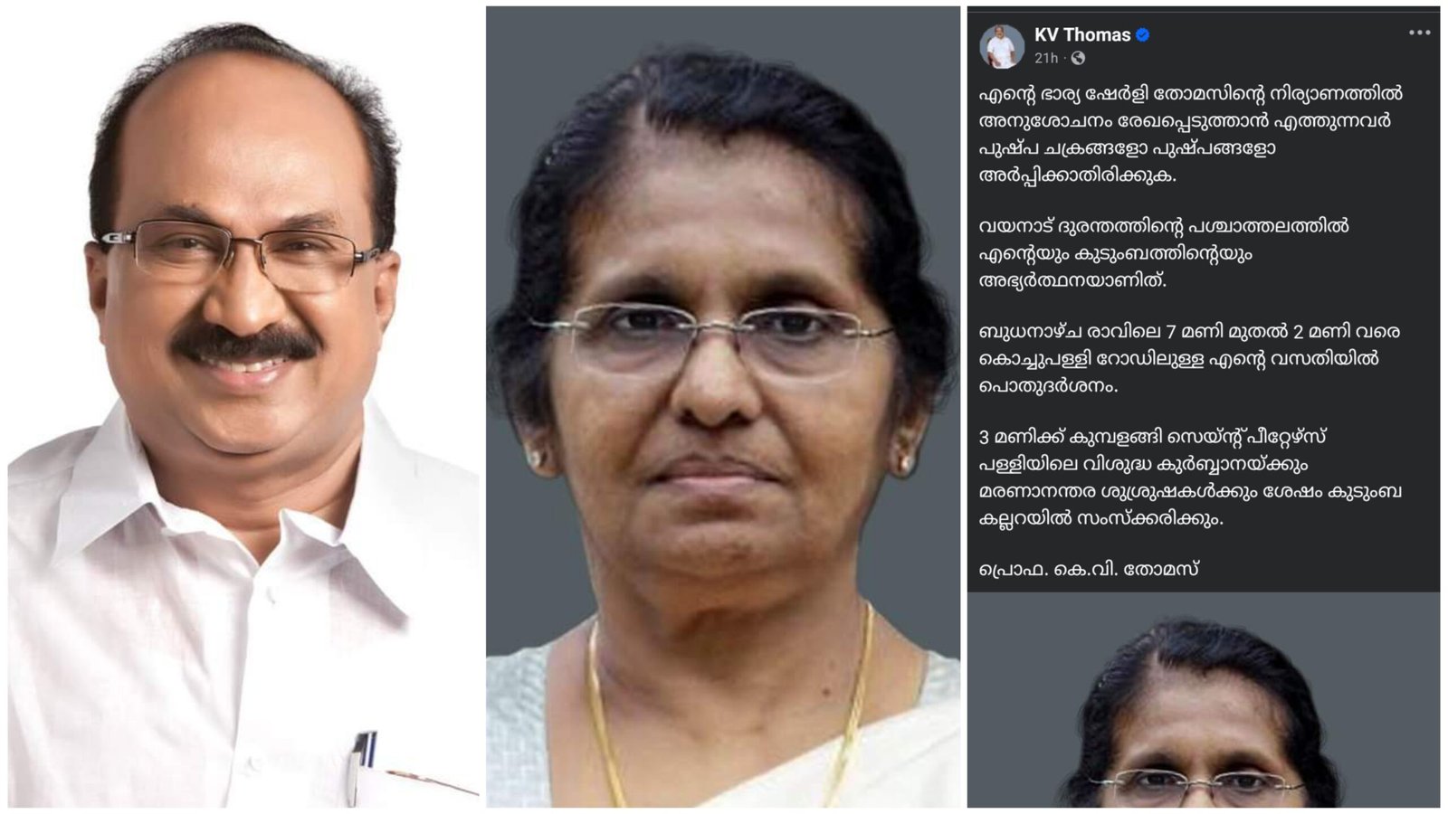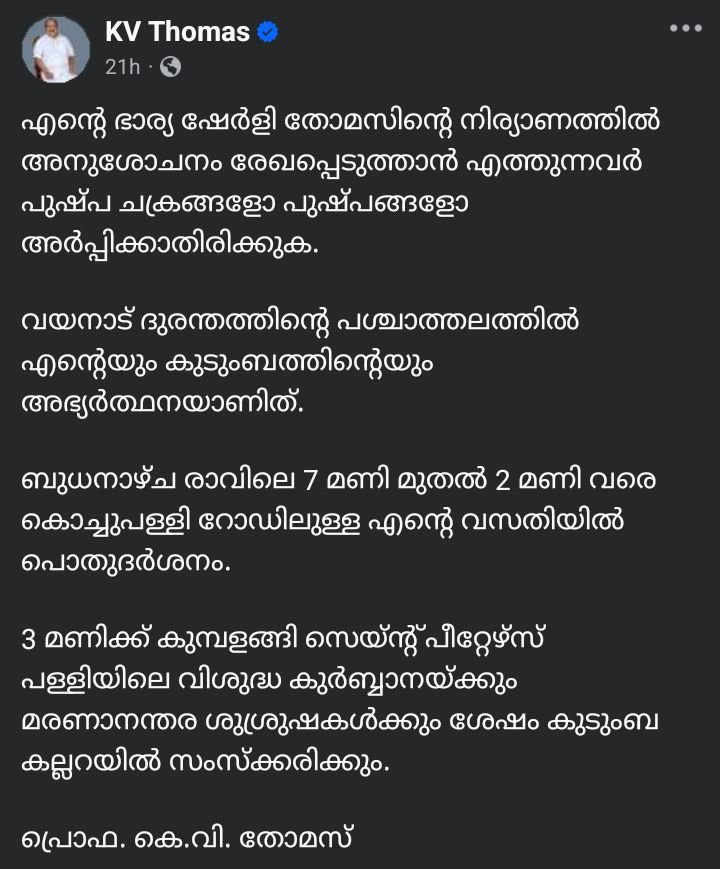 KV Thomas is one of the prominent political leaders of Kerala. His wife passed away last day. Many people are now coming forward to pay their respects. Many people visit his house. Now he has made a request to all of them. He has made a request on Facebook.
