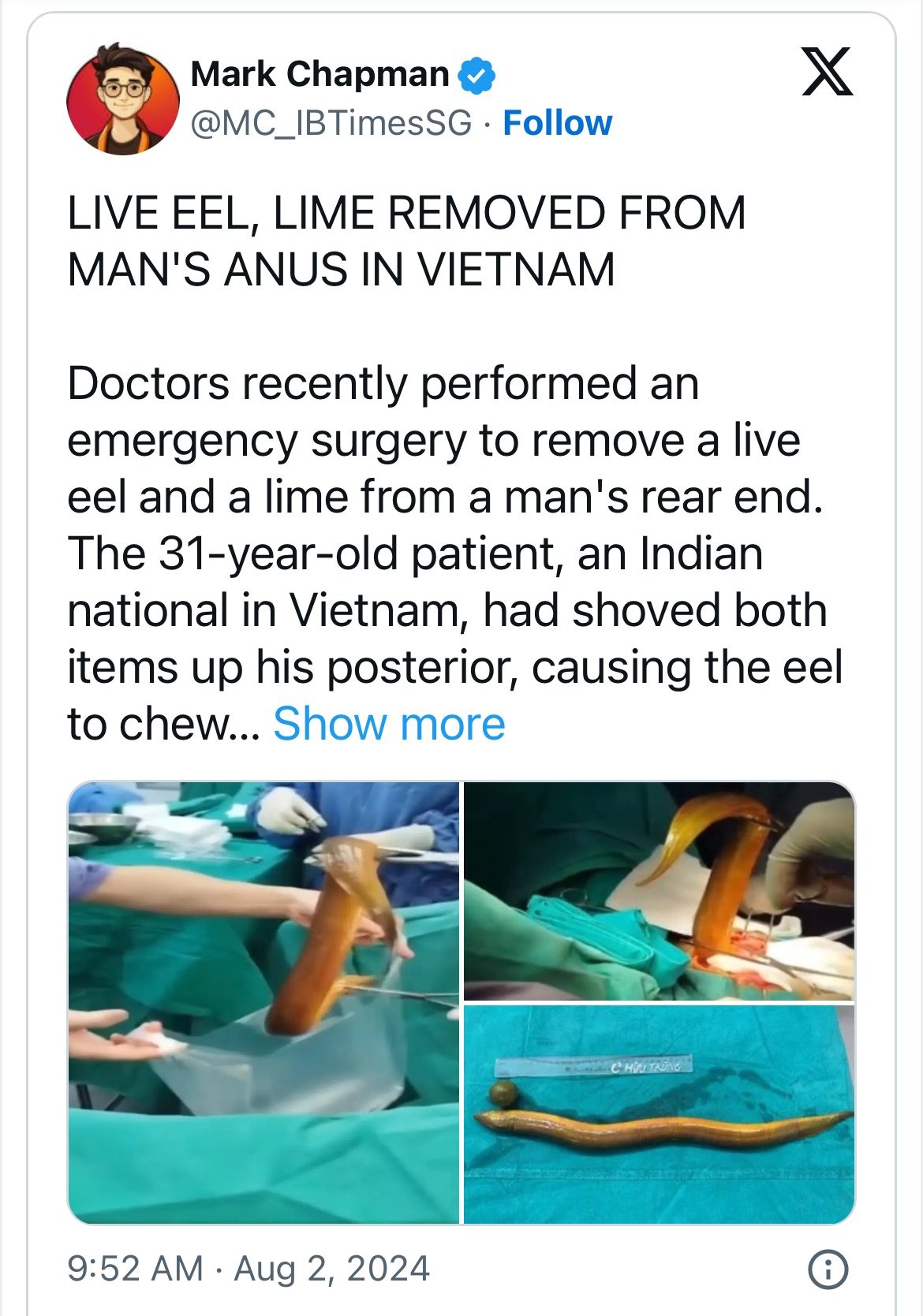 Doctors surgically removed the 25-inch-long, four-inch-wide eel from the young man’s esophagus, along with a lemon. The fish was pulled out alive. According to the New York Post, the young man also underwent a colostomy following the injury.