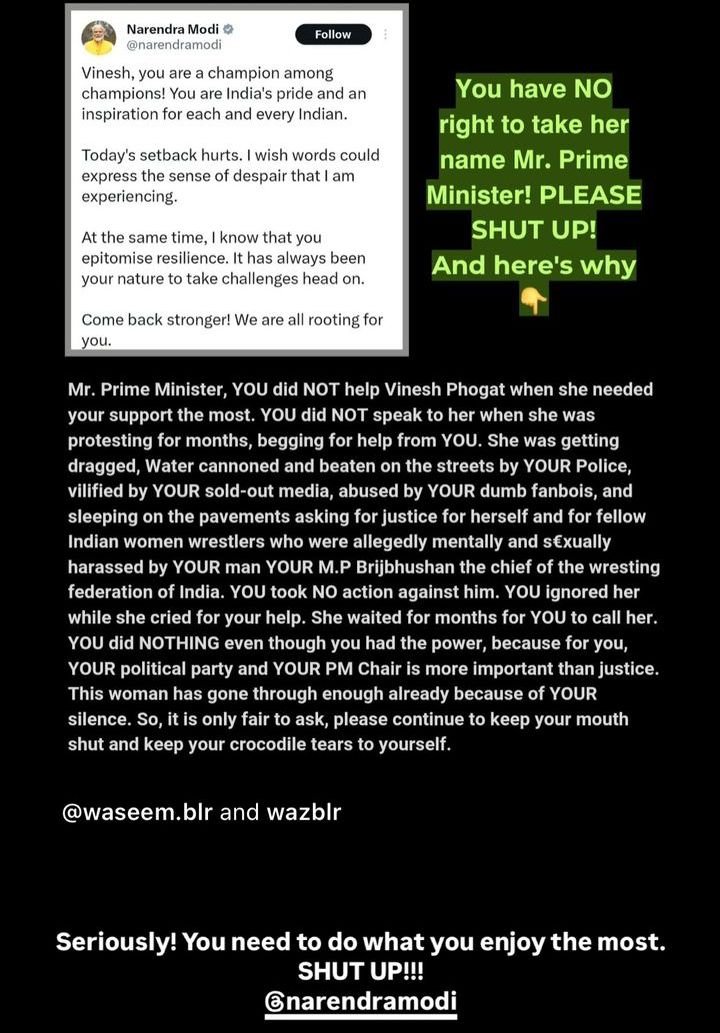 “You did not help them when they needed your support the most. They were struggling for months, begging for help, and you didn’t talk to them. They were dragged by your police in the street, faced with water cannons and beaten. The media supporting you were crucifying them. Many Indian boxer girls were sexually and psychologically exploited by your MP Brij Bhushan. You did not take any action against him. They waited for your reply for months. For you, your political party and your chair are bigger than justice. This is a person who has suffered a lot because of your silence. Keep quiet as you always do and keep your crocodile tears close to you” – this is what their post says.
